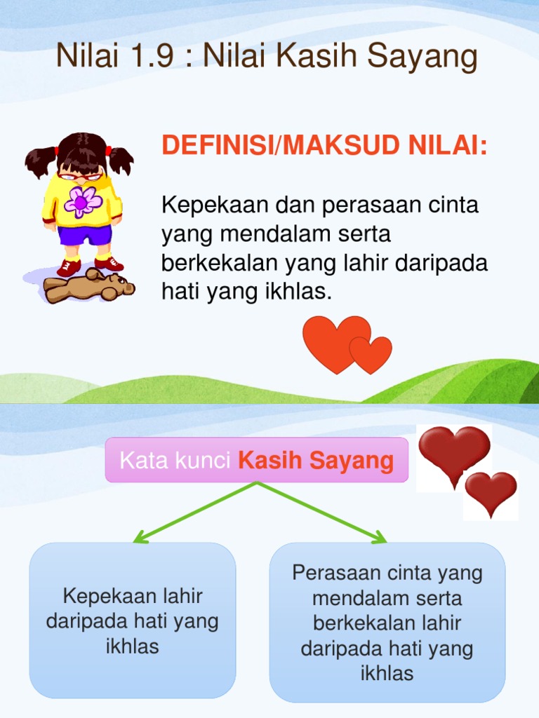 Pengertian Kasih Sayang Kasih sayang adalah bentuk perasaan yang menarik untuk dibahas. Ada juga perkataan sinonim dan berkaitan dengannya ada dipaparkan di sini. 1 Nilai Kasih Sayang Kasih Sayang terhadap keluarga.